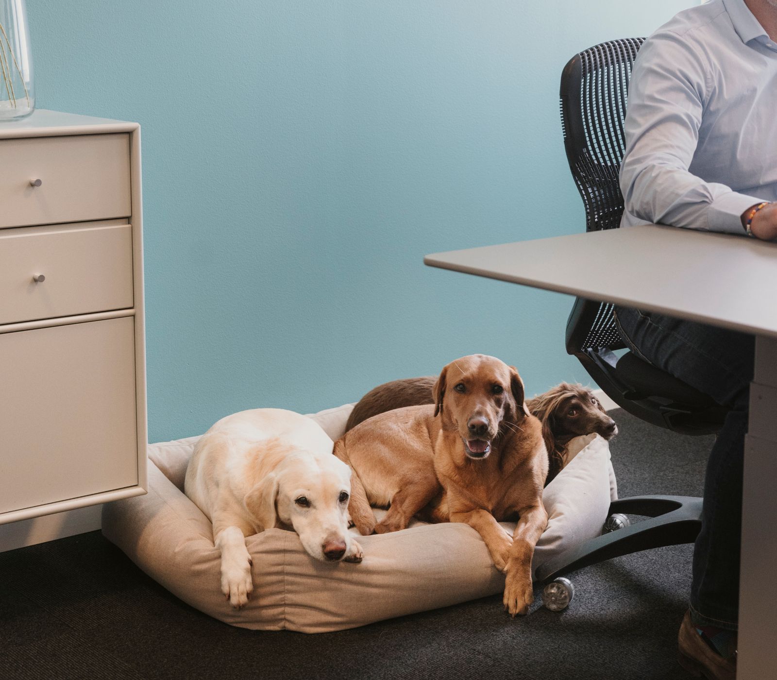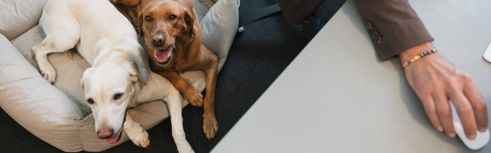 "Having the dogs with me simplifies organizing my day and minimizes the time they spend alone. It also adds joy to the office environment, as employees appreciate the chance to interact with them," shares Christian. His dogs are trained to understand their boundaries within the office, reinforcing the importance of obedience and training for workplace dogs.
